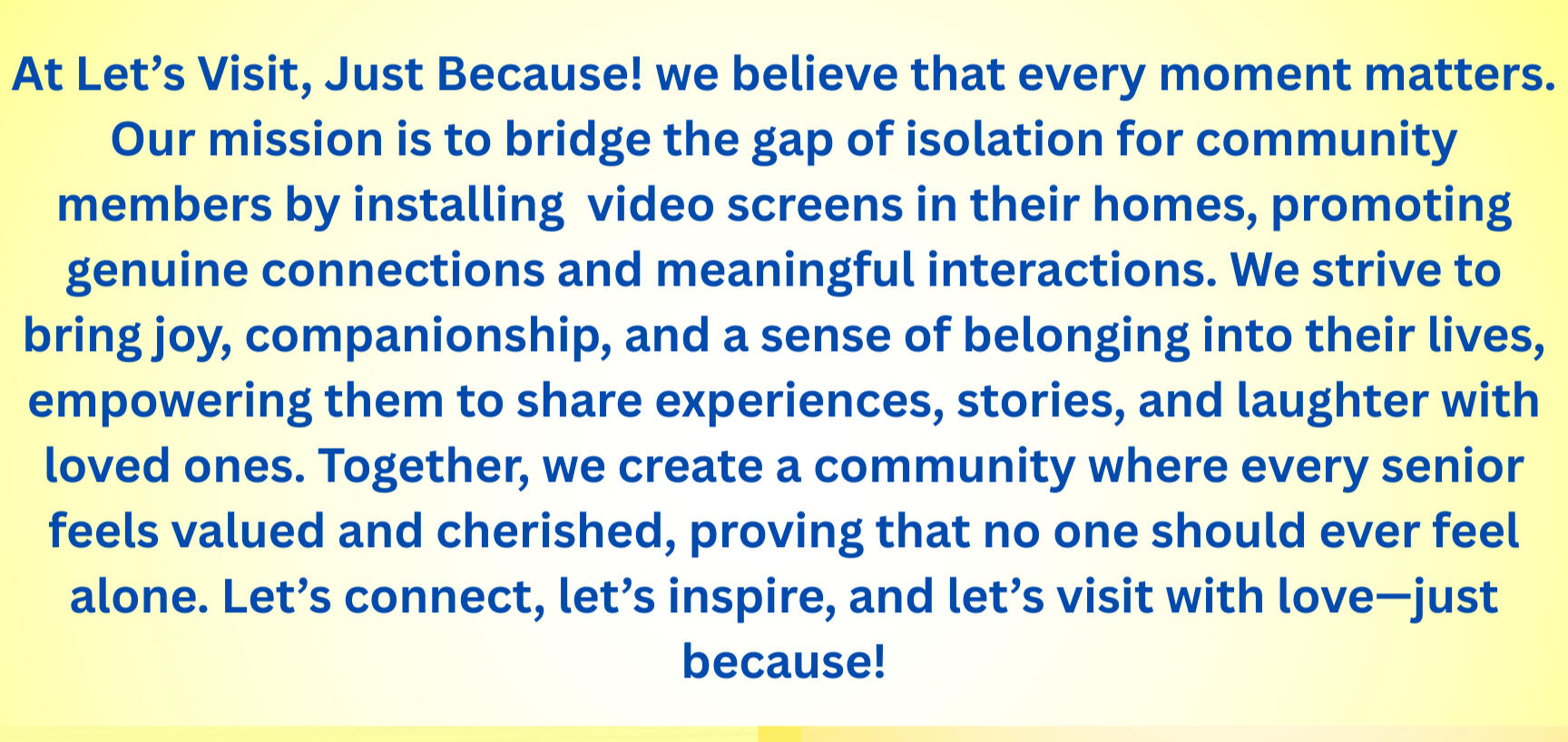 Let's Visit, Just Because is a small nonprofit with a simple big dream. There are over 61 million senior citizens in the U.S., with millions of them living in social isolation. Technology has enabled instant connections at the touch of a button, yet many elderly still find themselves left behind. Suicide is becoming a growing public health crisis, with the older population's suicide death rate increasing the most, social isolation being one of the main factors.